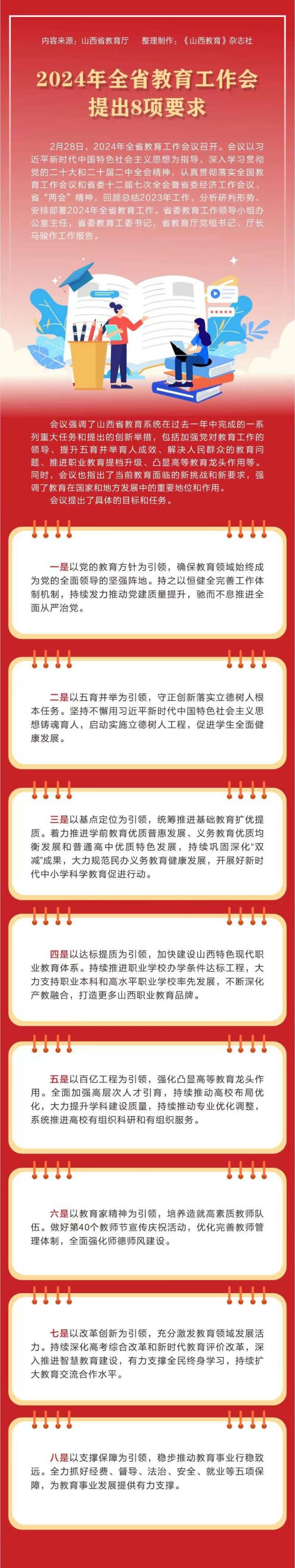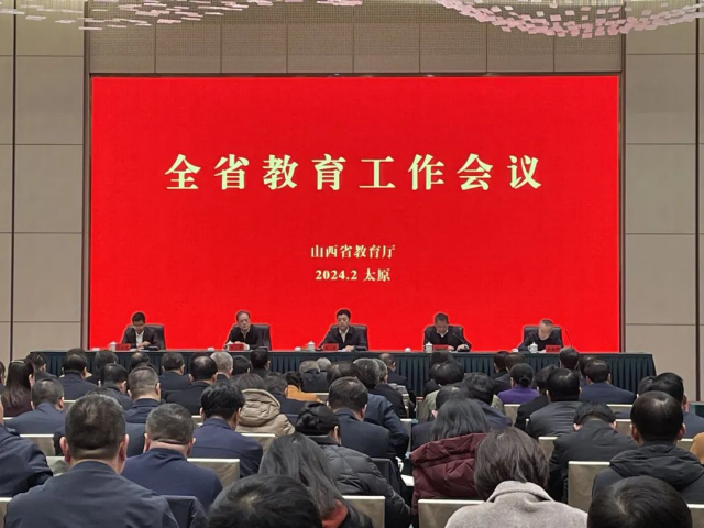 会议要求,2024年是中华人民共和国成立75周年,是实现“十四五”规划目标的攻坚之年,是教育强省建设的开局之年。要坚持稳中求进、以进促稳、先立后破,夯实“稳”的基础,增强“进”的动能,树立“破”的勇气,提高“立”的质效,全力确保教育强省建设高标准开局、高质量推进。一是以党的教育方针为引领,确保教育领域始终成为党的全面领导的坚强阵地。持之以恒健全完善工作体制机制,持续发力推动党建质量提升,驰而不息推进全面从严治党。二是以五育并举为引领,守正创新落实立德树人根本任务。坚持不懈用习近平新时代中国特色社会主义思想铸魂育人,启动实施立德树人工程,促进学生全面健康发展。三是以基点定位为引领,统筹推进基础教育扩优提质。着力推进学前教育优质普惠发展、义务教育优质均衡发展和普通高中优质特色发展,持续巩固深化“双减”成果,大力规范民办义务教育健康发展,开展好新时代中小学科学教育促进行动。四是以达标提质为引领,加快建设山西特色现代职业教育体系。持续推进职业学校办学条件达标工程,大力支持职业本科和高水平职业学校率先发展,不断深化产教融合,打造更多山西职业教育品牌。五是以百亿工程为引领,强化凸显高等教育龙头作用。全面加强高层次人才引育,持续推动高校布局优化,大力提升学科建设质量,持续推动专业优化调整,系统推进高校有组织科研和有组织服务。六是以教育家精神为引领,培养造就高素质教师队伍。做好第40个教师节宣传庆祝活动,优化完善教师管理体制,全面强化师德师风建设。七是以改革创新为引领,充分激发教育领域发展活力。持续深化高考综合改革和新时代教育评价改革,深入推进智慧教育建设,有力支撑全民终身学习,持续扩大教育交流合作水平。八是以支撑保障为引领,稳步推动教育事业行稳致远。全力抓好经费、督导、法治、安全、就业等五项保障,为教育事业发展提供有力支撑。